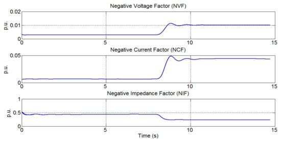 Figure 6 illustrates the time evolution of the three factors NVF, NCF, and NIF, while Table 2 shows the magnitudes of these factors and the rate of their changes after the USV occurrence. As can be clearly seen, the three factors present stable values when the motor operates under balanced voltages, but after the occurrence of a low severity USV (1%), a significant increase of 252% and 576% is observed on NVF and NCF, respectively. Meanwhile, the NIF was decreased by 47%. These results confirm that the presence of USV produces three voltage symmetrical sequences, of which the most damaging is the negative one. Therefore, a small negative sequence of voltage causes a large negative sequence of currents, resulting in large currents unbalance. This explains why the NCF has increased more than the NVF.