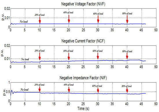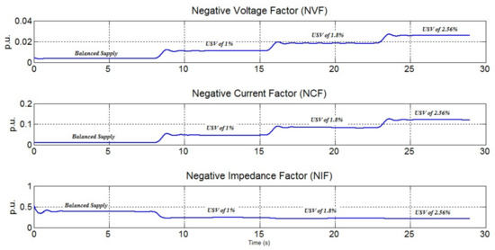 In this section, several tests are carried out in order to study the behavior of the three factors under successive increases on the USV’s severity. First, the test was started with a motor under balanced supply at no load. After a few seconds and using a programmable power supply, three different levels of USV (1%, 1.8%, and 2.56%) according to NEMA definition, were introduced successively. The curves depicted in Figure 7 show clearly that the proposed algorithm has the ability to compute and track successfully the time evolution of the studied factors.