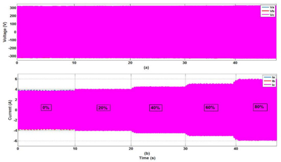 IM voltage and current waveforms for a balanced supply condition, under different step load variations.