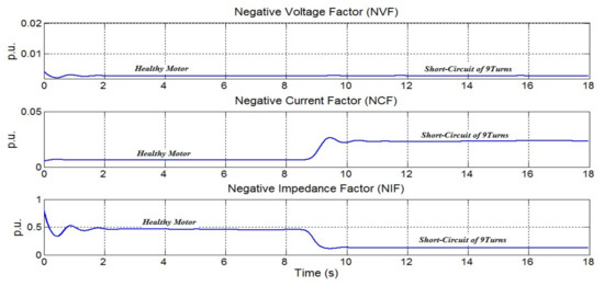 First, the motor was initially started at no load under healthy state conditions, and after a few seconds, nine turns of the phase “a” were short-circuited. During this operation, the three-phase currents and voltages were sampled and online treated by the proposed algorithm. The curves representing the time evolution of the studied factors are depicted in Figure 11, while Table 4 shows their rate of change due to this winding fault. As can be clearly seen, the NCF which was more sensitive to the USV is also sensitive to the ITSCF. Indeed, the NCF has increased considerably by 255% after the short-circuit of 9 turns. Consequently, the NCF cannot be considered as USV indicator because it behaves similarly for both ITSCF and USV, which can lead to a misdiagnostic.