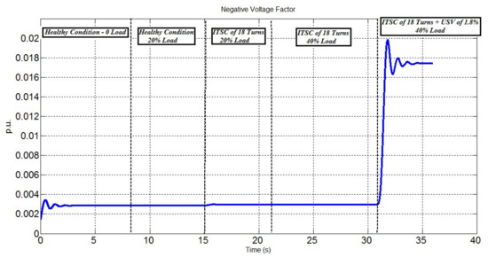 During these tests only the three-phase voltages are sampled and treated by the proposed algorithm. This permits an online calculation and a continuous displaying of the NVF as shown in Figure 12. As can be clearly seen, the NVF remains almost constant through the first four tests, and then it increases rapidly and significantly just after the occurrence of the USV. This confirms that the NVF is the best indicator for the USV problems in terms of reliability and sensitivity of detection, robustness against load variations or ITSCF, as well as to its simplicity of calculation since it requires only the acquisition of the three-phase voltages which are always available. As a result, the condition monitoring systems based on the NVF are easy to be implemented experimentally and can work successfully in real time.