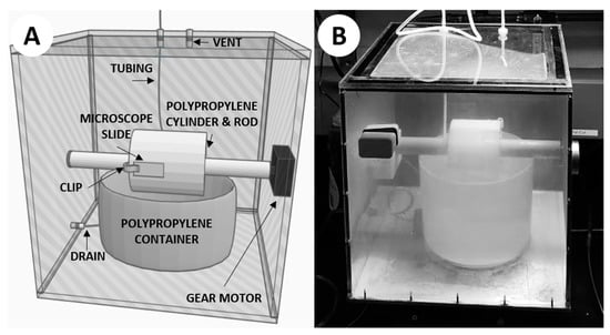 The construction of this simulation chamber was based on a prototype design conceived by Prof. David Deamer of UC Santa Cruz to facilitate the polymerization of monomers via wet–dry cycling (Figure A1 in Appendix A). The newly constructed apparatus we used for this study was designed to simulate a modern hot spring more closely, particularly an outflow stream where life is often observed and silica precipitation is commonplace. The chamber used the same rotating-cylinder technique, with some notable differences (Figure 2). A 12 × 12 × 0.25 inch aluminum sheet served as the base of the chamber, in order to efficiently transfer heat from a hot plate directly beneath the chamber. The walls of the chamber were constructed from 12 × 12 × 0.25 inch polycarbonate sheets affixed to the aluminum base, with the top cover being affixed with additional gasket material for sealing purposes. The cylinder was machined from polypropylene, with a 1-inch bore through the center in order to be mounted on a 1-inch diameter rotating rod. The rod was attached to a 1 RPM gear motor affixed through the outside of the chamber. A polypropylene container was placed directly below the rotating rod, so the cylinder could be partially submerged when the container is filled with fluid. Plastic clips were attached to the cylinder to mount 1 × 3 inch glass microscope slides so that they could be rotated into the fluid within the container and out again as the motor spun the rod. A small vent with 47-mm membrane filter (0.45-µm pore size) was placed on top of the system to relieve pressure while keeping the chamber clean from outside contaminants. Autoclavable tubing was used to deliver the simulated hot spring fluid from a polypropylene carboy mounted above the simulation chamber. The fluid would be added directly into the polypropylene container in the chamber via autoclavable tubing and could be removed from the container using a drain on the bottom side of the polypropylene container which was fed through the side of the chamber via autoclavable tubing. The completed chamber was assembled in a fume hood, and each component of the system was autoclaved to ensure sterilization, acid washed using a 10% solution of trace-metal grade (<1 ppb) nitric acid for ≥3 days, and triple-rinsed using 18.2 MΩ/cm deionized water.