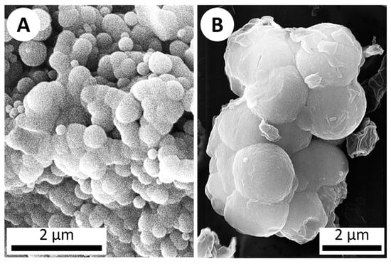 SEM imagery of botryoidal silica structures. (A) A secondary electron image (10 kV) of botryoidal silica precipitate from a sinter sample collected from Steep Cone hot spring in Yellowstone National Park. (B) ET-detector image (20 kV) of silica which precipitated on a microscope slide after 1 week in the hot spring simulation chamber (abiotic), displaying the same botryoidal texture characteristic of silica precipitation.