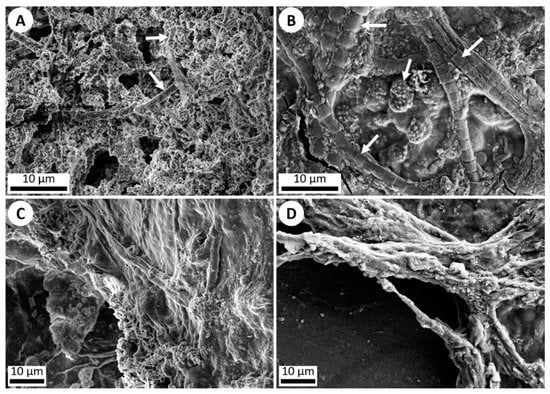 SEM imagery of silica precipitation and microbial life. (A) ET-detector image (5 kV) of silica precipitation exhibited around individual microbes (white arrows) in a Yellowstone National Park hot spring outflow stream. (B) ET-detector image (5 kV) of silica precipitation exhibited around various microbes (white arrows) which were added onto a microscope slide and run through the hot spring simulation chamber for 1 week. Silica precipitation can be observed starting to cover the organisms. (C) ET-detector image (5 kV) of a dense microbial mat collected from an outflow stream in Yellowstone National Park, showing silica precipitation. (D) ET-detector image (10 kV) of a dense microbial mat of various non-hot spring cyanobacteria added onto a microscope slide and run through the hot spring simulation chamber for 1 week, once again exhibiting silica precipitation coating the mat.