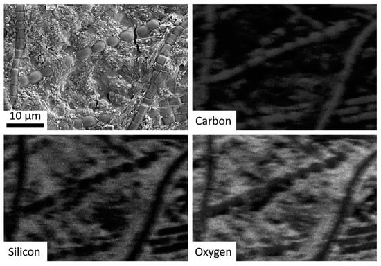 SEM imagery of bacteria run through the hot spring simulation chamber, with subsequent panels showing EDS mapping for carbon (co-localized with the bacteria), silicon, and oxygen (i.e., silica).