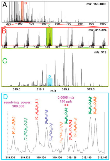 Progressively zoomed in mass spectra (A–D) of Murchison meteorite soluble organic extracts, each focusing on a more narrow region within the previous spectrum, showing the diversity of meteoritic organics (and analyses). In (D), 11 molecular assignments were made in a narrow range of 0.012 Da, which suggests that even in such a narrow range, a large diversity of isomers may have existed in primitive chemical milieu. Reprinted with permission from Schmitt-Kopplin, Gabelica, Gougeon, Fekete, Kanawati, Harir, Gebefuegi, Eckel, and Hertkorn, 2010. “High molecular diversity of extraterrestrial organic matter in Murchison meteorite revealed 40 years after its fall.” Proc. Nat. Acad. Sci. USA. 107(7):12763-2768. [12] Copyright Schmitt-Kopplin, et al., with an exclusive License to Publish to NAS.