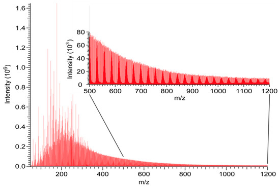Mass spectrum of a complex product mixture from a laboratory simulation of an atmospheric discharge reaction consisting of liquid water, methane gas, and ammonium gas starting materials in the presence of cyanamide, showing the remarkable chemical diversity produced from a prebiotically plausible organic chemical reaction. Reprinted with permission from Parker, Cleaves, Bada, and Fernandez. “Quantitation of α-hydroxy acids in complex prebiotic mixtures via liquid chromatography/tandem mass spectrometry.” Rapid Commun. Mass Spectrom. 30(18):2043–2051. [23] Copyright John Wiley & Sons, Inc.