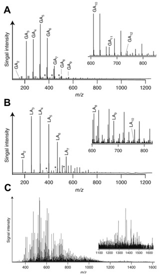Mass spectra showing the synthesis of polyesters from simple drying of solutions of the alpha hydroxy acids (αHAs) (A) glycolic acid (GA), (B) lactic acid (LA), and (C) a mixture of five different αHAs (LA, GA, DL-2-hydroxy-4-methylpentanoic acid, DL-2-hydroxy-4-(methylsulfanyl) butanoic acid, and DL-3-phenyllactic acid). Insets show higher m/z regions. Asterisks represent peaks showing water loss. Reprinted with permission from Chandru, Guttenberg, Giri, Hongo, Butch, Mamajanov, and Cleaves. 2018. “Simple prebiotic synthesis of high diversity dynamic combinatorial polyester libraries.” Commun. Chem. 1:30. [38] under a Creative Commons License.