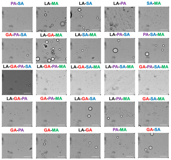 Rehydration of polyesters formed from wet–dry cycling of mixed αHA mixtures results in spontaneous assembly of microdroplets. LA = lactic acid, GA = glycolic acid, PA = phenyllactic acid, SA = 2-hydroxy-4-(methylsulfanyl)butanoic acid, MA = 2-hydroxy-4-methylpentanoic acid. Reprinted with permission from Jia, Chandru, Hongo, Afrin, Usui, Myojo, and Cleaves. 2019. “Membraneless polyester microdroplets as primordial compartments at the origins of life.” Proc. Nat. Acad. Sci. USA. 116(32):15830-15835. [40] Copyright Jia, T.Z., Chandru, K., et al., with an exclusive License to Publish to NAS.