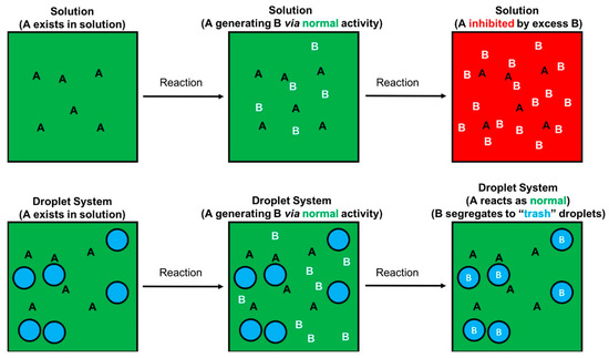 Top: A prebiotic chemistry scenario in which a chemical, A, participates in a chemical reaction and produces a toxic byproduct, B, a molecule that inhibits reactions involving A. B accumulates and eventually results in the complete inhibition of reactions involving A (to produce B). Bottom: Chemical A in solution, coexisting with polyester droplets (blue). A produces the toxic molecule B as a byproduct. However, assuming A and B are sufficiently different chemically, B could preferentially partition into the droplets due to B’s affinity for that phase (due to polarity, electrostatic interactions, sterics, etc.), allowing A to continue reacting uninhibited by B. It should be stressed that this is but one possible scenario for the role such droplets could play in higher order prebiotic chemistry, one can easily enumerate numerous other, more complex systems, that could be explored experimentally.