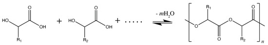 Simple dehydration synthesis of an arbitrary number of αHAs with side-chains R1 and R2 (left), resulting in production of polyester polymers through condensation by loss of water molecules.