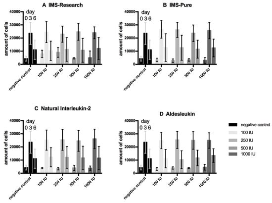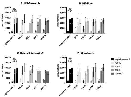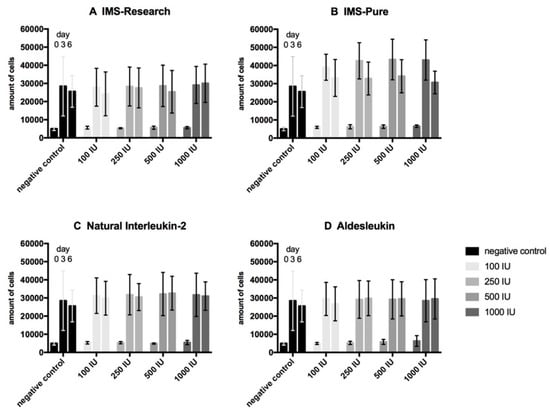 Proliferation assay of fibroblasts. Mean values of technical and biological triplicates were analyzed. Cells were tested with four different IL-2 types (IMS-Research, (A); IMS-Pure, (B); Natural IL-2, (C); Aldesleukin, (D)) in four different concentrations (100 IU/mL, 250 IU/mL, 500 IU/mL, 1000 IU/mL), and compared to a negative control. The absolute number of cells on day 0, 3, and 6 is displayed in each group bars of the same color.