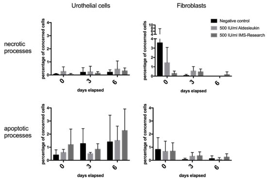 Apoptosis/necrosis of urothelial cells and fibroblasts. The assay was conducted and data were evaluated and displayed in percentage of concerned cells (Y-axis). The development of this percentage was displayed over a test period of six days (X-axis). Aldesleukin and IMS-Research in a concentration of 500 IU/mL were used in comparison with the negative control. Fibroblasts and urothelial cells in single culture were tested and displayed.