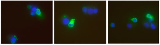Images of the positive control with stained porcine T-lymphocytes with a primary antibody against CD25 and a secondary antibody crosslinked with a fluorochrom (Alexa Fluor 488), detected with immunofluorescent microscopy (60×).