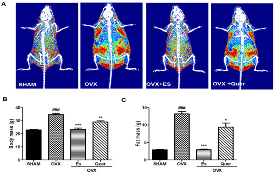 To investigate the effects of Quer on body composition, body mass, and fat mass, DXA was performed. Images of all groups are displayed as radiographs of body fat distribution. OVX mice displayed larger red areas rather than blue and yellow areas, indicating a higher fat density than that of areas with low and intermediate fat densities. Quer-treated mice displayed a lower fat density than that of OVX mice. The body (p < 0.01) and fat mass (p < 0.05) distribution in Quer-treated mice was significantly lower than those in OVX mice (Figure 1).