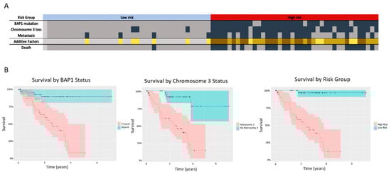 A loss of function mutation in BAP1 is a very strong predictor of metastasis, and was found in 24 cases of this cohort, all of which were placed into the high-risk group. All cases in the high-risk group had one or more important markers of poor outcome (either confirmed metastatic UM, chromosome 3 loss, and/or confirmed BAP1 mutation), suggesting that these cases all show high metastatic potential as compared to the cases designated into the low-risk group (Figure 4).