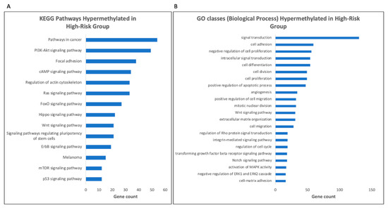 Selected list from the most highly affected Gene Ontology (GO) pathways between the two groups based on differentially methylated genes (log fold change of 1.5× or more between the high and low risk groups) for (A) KEGG pathways and (B) GO biological process classes. Pathways sorted by number of genes in each class, analysis done in DAVID using EASE score of 0.05.