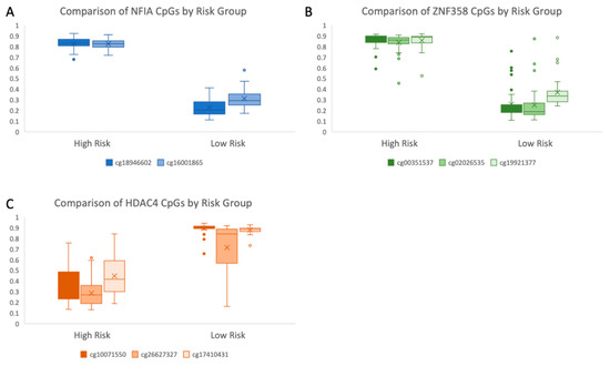 Box and whisker plots of average Beta values for all cases across selected highly differentially methylated probes, separated by high and low risk group, for (A) the NFIA gene (designated in blue and orange), (B) the ZNF358 gene (designated in blue, orange, and grey) (C) the HDAC4 gene (designated in blue, orange, and grey). Full list of differentially methylated probes for each of these genes available in Supplementary Tables S9, S11 and S13.