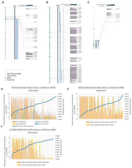 Degree of methylation at selected loci across all cases (n = 80), sorted in order of increasing gene expression (lowest to highest gene expression) for (A) the NFIA gene (B) the HDAC4 gene and (C) the IL12RB2 gene. For each probe, * p < 0.05, ** p < 0.01, *** p < 0.001. Selected methylation beta values vs. mRNA expression z-scores relative to all samples (mRNA expression data obtained through the cBioPortal for Cancer Genomics as log RNA Seq V2 RSEM) for (D) the NFIA gene (E) the HDAC4 gene, and (F) the IL12RB2 gene.
