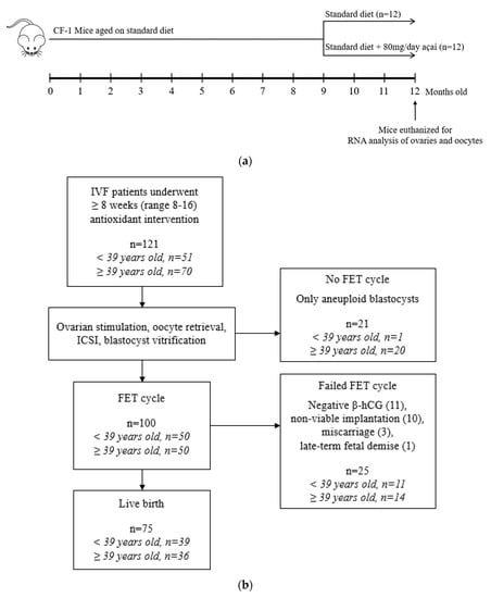 The primary aim of this study was to determine the effects of antioxidant treatment on gene expression in ovaries and oocytes of aged mice. We utilized the naturally occurring açaí berry (Euterpe oleracea) as it contains flavonoids that are potent scavengers of oxygen free radicals and ROS, and it shows therapeutic benefit in several studies investigating aging impact [35,36]. Dietary antioxidant supplementation was sufficient to alter gene expression in both ovaries and oocytes. Signaling pathways that are impacted by aging, i.e., antioxidant and apoptosis, were altered by antioxidant treatment. We then evaluated the feasibility of antioxidant administration in patients prior to an IVF cycle and determined that patients were compliant with the antioxidant regimen, where it was found that reproductive outcomes in AMA and younger counterparts were comparable. We conclude that antioxidant supplementation is a feasible and promising strategy to improve ovarian function during reproductive aging, warranting further investigation.