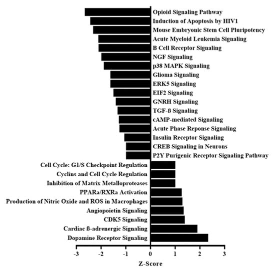 Pathway analysis of the differentially expressed genes in aged murine ovaries following antioxidant intervention. Cellular pathways with altered expression after antioxidant intervention compared to control diet, with p < 0.05 and Z-score >1 or <−1, are presented.