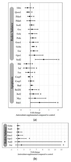 Antioxidant intervention altered the gene expression of factors important in redox signaling in murine oocytes (Figure 3b). Expression levels of three important antioxidant genes—glutathione peroxidase (GPX1), SOD2, and glutathione reductase (GSR)—were markedly higher in oocytes from mice treated with antioxidants compared to control diet.