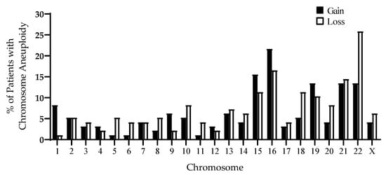 Types of aneuploidies in blastocysts from antioxidant-treated patients (n = 553 blastocysts, 100 IVF cycles). The percentage of patients with a gain or loss of each chromosome is presented.