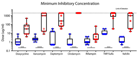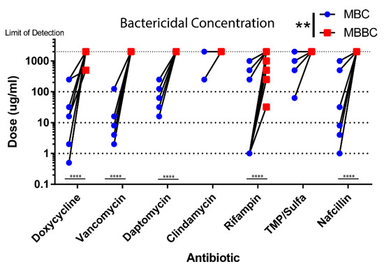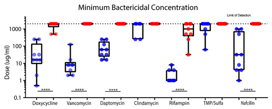 Comparison of bactericidal activity of clinically relevant antibiotics against planktonic MBC (blue) and biofilm MBBC (red) of the tested antibiotics against S. epidermidis. Serial dilution and CFU counts were used to compare MBC and MBBC. A Mann–Whitney significance test was used (**** p < 0.0001). Nearly all antibiotics demonstrated significant results, with a p-value of less than 0.0001; however, clindamycin and TMP/sulfa were equally ineffective at eradication of either planktonic or biofilm cultures.