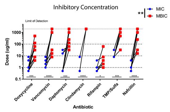 Mature biofilms MBIC (red) demonstrate decreased inhibition sensitivity to clinically significant antibiotics when compared to planktonic MIC (blue). PrestoBlue staining assay was performed to compare MIC and MBIC. Statistical comparison of planktonic MIC and biofilm MIC (MBIC) was conducted using a Mann–Whitney test. Significance is indicated (**** p < 0.0001, *** p = 0.0001, ** p < 0.001, * p < 0.05), and most antibiotics demonstrated significant increases in MIC.