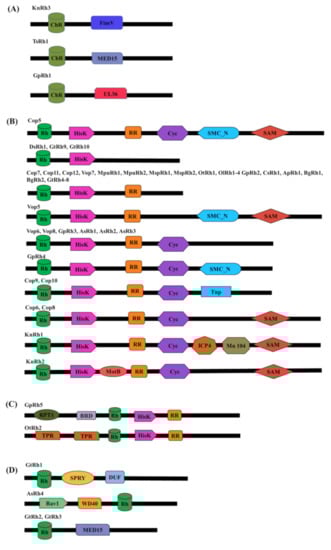 | HisK-RR (Histidine kinase-response regulator) Two-component signaling system | GtRh4-8, Cop5-12, Vop5-8, AsRh1-3, GpRh2-5, KnRh1 & 2, OtRh1&2, OlRh1-4, MpuRh1&2, Msp1&2, CsRh1, ApRh1, BgRh1&2 | Regulates gene expression and various other cell processes via output domain like helix-turn-helix (HTH), RNA, enzyme, or ligand-binding domain. |