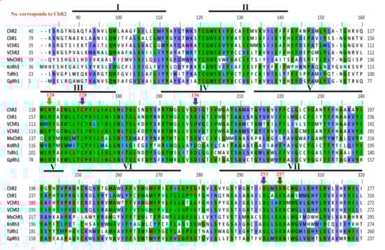 - Inoue, K.; Marín, M.D.C.; Tomida, S.; Nakamura, R.; Nakajima, Y.; Olivucci, M.; Kandori, H. Red-shifting mutation of light-driven sodium-pump rhodopsin. Nat. Commun. 2019, 10, 1–11. [Google Scholar] [CrossRef]