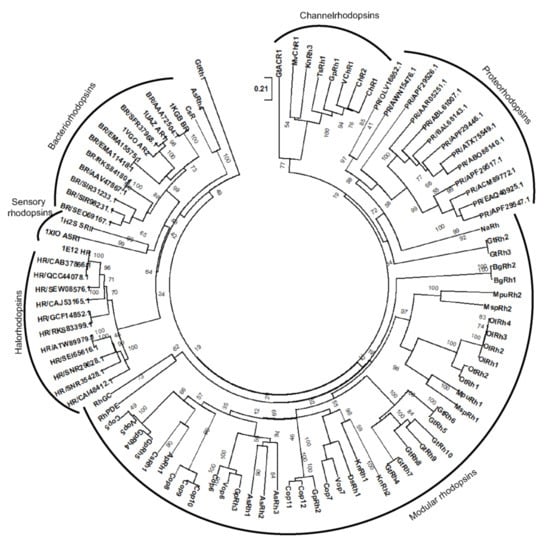 - Ruiz-González, M.X.; Marín, I. New insights into the evolutionary history of type 1 rhodopsins. J. Mol. Evol. 2004, 58, 348–358. [Google Scholar] [CrossRef]