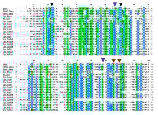 - Trieu, M.M.; Devine, E.L.; Lamarche, L.B.; Ammerman, A.E.; Greco, J.A.; Birge, R.R.; Theobald, D.L.; Oprian, D.D. Expression, purification, and spectral tuning of RhoGC, a retinylidene/guanylyl cyclase fusion protein and optogenetics tool from the aquatic fungus Blastocladiella emersonii. J. Biol. Chem. 2017, 292, 10379–10389. [Google Scholar] [CrossRef]