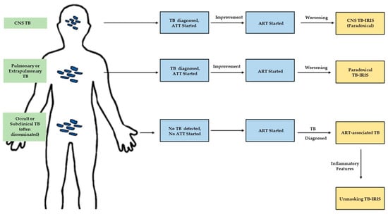 Diagnostic categories of TB-IRIS depend on the sequence of ATT (antitubercular therapy) and ART (antiretroviral therapy) initiation, as well as the site of TB at ART initiation. Paradoxical IRIS is diagnosed when pulmonary or extrapulmonary TB worsens after ART initiation in a patient who previously responded to ATT. ART-associated TB is any TB diagnosed after ART initiation, while unmasking TB-IRIS is a subcategory where the TB presentation is markedly inflammatory. We add a final major category of CNS-TB-IRIS based on its unique pathologic and therapeutic considerations.