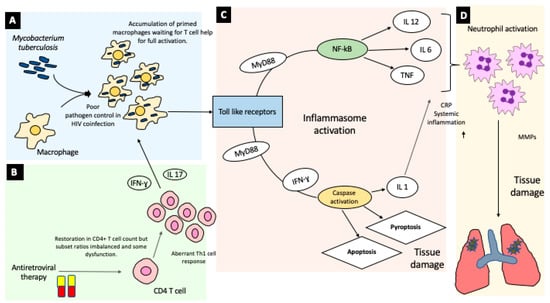Figure 2. Model of TB-IRIS Pathogenesis. (A). HIV-related immune suppression leads to proliferation of TB in macrophages. (B). Antiretroviral therapy leads to increasing CD4 T cell counts, while the Th1 cell response remains dysregulated. Interferon signaling leads to an exuberant immune response against TB-infected cells. (C). This primed immune response to TB involves activation of Toll-like receptors, which leads to a two-pronged inflammatory cascade involving the inflammasome., with subsequent caspase activation and tissue damage, as well as activation of cytokines including TNF, IL6, and IL12. (D). Neutrophils are activated by this inflammatory cascade, especially IL-1, and they migrate to affected organs, leading to tissue damage mediated by matrix metalloproteinases (MMPs).