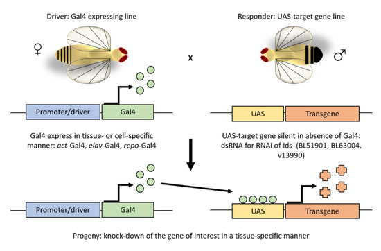 The UAS/Gal4 system. The UAS/GAL4 is the most used method in the fruit fly to ectopically express or knockdown a gene of interest in a tissue- or cell-specific manner. It involves two independent transgenic lines, which are based on the yeast transcriptional activator GAL4 and its high-affinity binding site, the upstream activating sequence (UAS). Crossing a tissue-specific GAL4 line to an effector line that carries the UAS fused to a gene of interest, progeny with both the GAL4 and UAS components express the gene of interest in an activator-specific manner. As in this study, such approach allows for silencing of the Ids gene by overexpressing an UAS- Ids-RNAi construct.