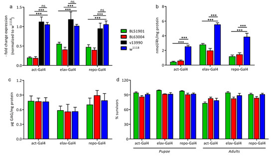 Next, we performed a lethality test to assess whether we can detect any effect of the knockdown approaches on the survival rate. However, as shown in Figure 2d, no differences were detected. In all Ids knockdown models, neither the survival from larva to pupa nor the metamorphosis to the adult phase was affected, contrary to the observations in the Drosophila MPS VII model [13].