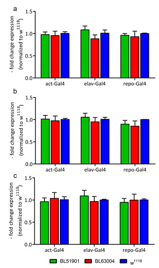 Tissues were homogenized using a Precellys 24 homogenizer (Bertin Technologies, Darmstadt, Germany) and RNA was isolated from 1-day-old adult flies using TRIzol™ Reagent (Thermo Fisher Scientific, Darmstadt, Germany) according to the manufacturer’s protocol. When the RNAi lines were ubiquitously expressed in combination with the act-Gal4 driver line (act-Gal4 progeny), 5 flies were homogenized for each experiment. When the RNAi lines were expressed in neurons or glial cells in combination with the elav-Gal4 or repo-Gal4 driver lines (elav-Gal4 or repo-Gal4 progeny), 15 heads were homogenized for each experiment. cDNA was generated using the LunaScript™ RT SuperMix Kit (New England BioLabs, Frankfurt am Main, Germany). Real-Time PCR (RT-qPCR) was performed using Luna® Universal qPCR Master Mix (New England BioLabs) with a CFX Connect Real-Time PCR Detection System (Bio-Rad, Feldkirchen, Germany). Values were normalized against Ribosomal protein 49 (rp49) as reference gene and wild type control (ΔΔCq). Table 1 shows the sequences of the gene specific primers used. Each experiment was repeated in triplicate at least 5 times.