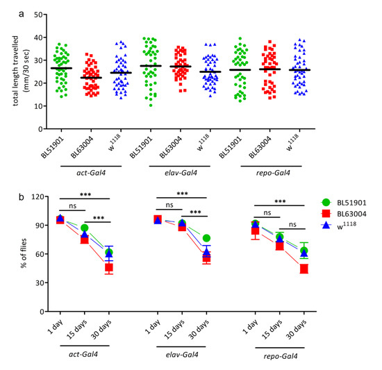 To finally assess whether Ids downregulation resulting in diminished enzymatic activity could lead to behavioral defects in these fruit fly models, crawling and climbing assays were performed. The distance travelled by larvae of any of the knockdown RNAi lines in combination with either ubiquitous, neuronal or glial driver did not differ from w1118 controls (Figure 4a) indicating no locomotor defects in this stage. The climbing assay showed a reduction in the negative geotaxis behavior of the flies with increasing age. However, 15- and 30-day-old flies of all knockdown lines together with all different driver lines showed a similar reduction in the climbing ability with no significant difference in comparison to w1118 controls (Figure 4b). These results suggest no age-dependent neurodegeneration, contrary to what was observed in Drosophila models for MPS IIIA and MPS VII, in which climbing defects were seen starting at the age of 1 week and worsening with increasing age [12,13]. In particular, in the MPS IIIA, 45–65% of pan-neuronal SGSH knockdown flies are unable to cross the defined cut-off line already at day 1, and 65–85% at day 15 [12], whereas no differences were detected among 1-, 15-, and 30-day-old flies of the MPS II fruit fly models as compared to controls.