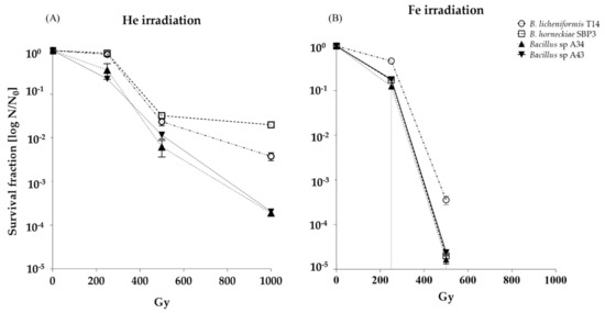 Spores survived He irradiation until the highest dose, whereas they were drastically reduced at Fe ions, which are known to present more lethal effects to spores than He nuclei. Spores from thermophiles survived irradiation better than psychrotolerants, and T14 spores possessed the greatest resistance to Fe nuclei.