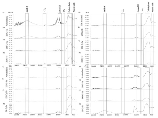 FTIR spectra of spores from Bacillus horneckiae SBP3, Bacillus licheniformis T14, Bacillus sp. A34, and Bacillus sp. A43 non-irradiated (a) and irradiated with He 250 Gy (b), He 1000 Gy (c), and Fe 250 Gy (d).