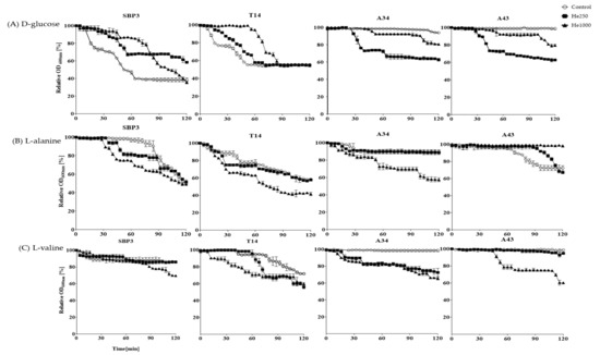 He irradiation differently affected spore germination at different extents, depending on the dose of irradiation. After He irradiation at 250 Gy, in the presence of D-glucose, the lag-time of thermophiles increased, and therefore germination was much slower than in non-treated spores (Table S1, Figure 3). Interestingly, germination of psychrotolerant A34 and A43 spores was induced with D-glucose after He expositions at 250 Gy (Figure 3). In the presence of amino acids, the lag-time of all spores was shorter, with the only exception being L-alanine for A43 spores (Table S1). After exposure to the maximum dose of irradiation with He ions (1000 Gy), all spores germinated slower with D-glucose than spores irradiated at 250 Gy dose (Figure 3). In the presence of alanine, germination enhanced in the respect of both non-irradiated and irradiated spores at He 250 Gy, with the only exception being spores from A43, which were blocked in germination. In presence of L-valine, all spores exhibited an increased germination, including spores from A43. In general, germination efficiency greatly increased after exposure to He 1000 Gy, with SBP3 and T14 being more efficient (34–64% loss of OD600nm) than A34 and A43 (5–47% decrease OD600nm) (Table S1).