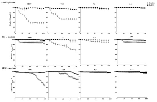 Germination curves of spores non-irradiated (white circles) and irradiated with Fe 250 Gy (black squares) in the presence of the germinant agents: (a) D-glucose, (b) L-alanine, and (c) L-valine. Germination was monitored as relative absorbance percentage (OD600nm%) at regular intervals (2 min) for 120 min of exposure to 50 mM germinant compound.