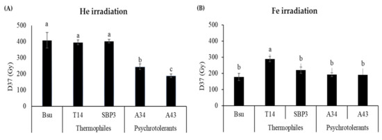 Spore inactivation, expressed as D37 values (Gy) after exposure to heavy ions of (A) helium (He) and (B) iron (Fe) of environmental thermophiles Bacillus horneckiae SBP3 and Bacillus licheniformis T14, and psychrotolerants Bacillus sp. A34 and A43, with comparison to Bacillus subtilis 168 (Bsu, data from Moeller et al. [47]). Resistance of spores is expressed as averages and standard deviations (n = 3). For each graph, the lowercase letters above the bars denote groups with significant differences by ANOVA (p ≤ 0.05).