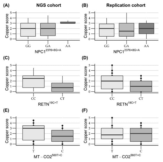 Boxplots of copper score associations between different genotypes in the NGS and replication cohort. (A,B) Boxplots show a positive significant association between copper score and the non-reference A allele for the variation rs85069010 in NPC1 in the NGS but not in the replication cohort. (C,D) Boxplots show a significant negative association between copper score and the non-reference T allele for the variation rs852470997 in RETN in both the NGS and replication cohort. (E,F) Boxplots show a significant negative association between copper score and the non-reference C allele for the variation NC_002008.4:MT.7593T>T in MT-CO2 in the NGS but not in the replication cohort.