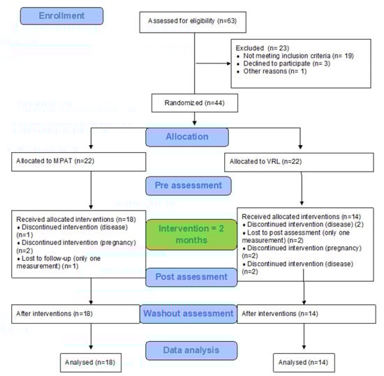 From 63 eligible people with multiple sclerosis, 44 consented and were randomly divided into two groups (22 into Group 1 and 22 into Group 2). Of these, 18 participants in Group 1 and 14 in Group 2 underwent the whole program (all three measurements) (Figure 1).