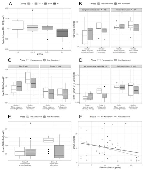 Influence of patients’ characteristics on neurohormone levels. (A). The effect of EDSS on cortisol change between post- and pre-assessment. The higher EDSS the higher decrease in cortisol levels. (B). Long-term corticoid users had lower levels of cortisone, mostly in the motor program activating therapy (MPAT group). For patients with Vojta’s reflex locomotion PT (physical therapy) lowered the levels compared to the MPAT group. (C). Men had higher 7α-OH-DHEA levels pre-assessment and sex had no significant effect on change during PT. (D). Long-term corticoid users had lower levels of 7β-OH-DHEA. For patients with Vojta’s reflex locomotion PT (physical therapy) lowered the levels compared to the MPAT group, irrespectively of corticoid use. (E). Effect of Vojta’s reflex locomotion PT compared to MPAT on 7-oxo-DHEA. There was also a baseline effect of EDSS—the higher the EDSS the lower the 7-oxo-DHEA (not shown). (F). While PT did not influence DHEA levels, the effect of disease duration was pronounced.