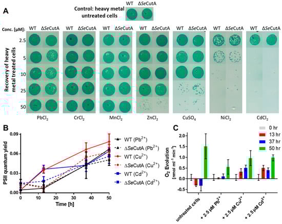 When exposed to low concentrations of heavy metals (2.5 µM) and nitrogen starvation, the WT and ∆cutA cells were able to resuscitate on nitrate-supplemented BG11 plates lacking heavy metals (Figure 1A; first row). These results were confirmed further by measuring the recovery of the photosynthetic apparatus (photosystem II; PSII) using pulse-amplitude-modulation (PAM) fluorometry for WT and ∆cutA cells, resuscitating from a long period (28 days) of chlorosis in the presence of 2.5 µM heavy metals (PbCl2, CuSO4 or CdCl2). Over 50 h of resuscitation, the efficiency of PSII regeneration for WT and ∆cutA cells was comparable (Figure 1B). Additionally, in agreement with the increase in PSII quantum yield in Figure 1B, photosynthetic oxygen evolution of the same cells was also recognizable after 50 h of resuscitation (Figure 1C). However, the net oxygen evolution of heavy-metal-treated cells was reduced by 30 to 40% in comparison to untreated cells, implying that the cells were severely stressed by the presence of all the heavy metals tested but were still able to recover. A similar phenotype was observed for the ∆cutA mutant. This observation motivated us to check further for the influence of higher concentrations of heavy metals on chlorotic cells.