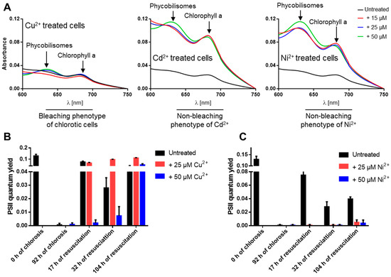 The non-bleaching phenotype of nitrogen-starved and heavy-metal-treated S. elongatus cells leads to cell death. (A) Absorption spectra of nitrogen-starved and heavy-metal-treated cells as indicated, revealing impair degradation of phycobiliproteins and chlorophyll a under Cd2+ and Ni2+ treatment. (B,C) The PSII quantum yield for the recovery of resuscitated cells from chlorosis and high metal concentrations (25 or 50 µM) of Cu2+ (B) or Ni2+ (C) by PAM fluorometry under a light intensity of 50 µE.