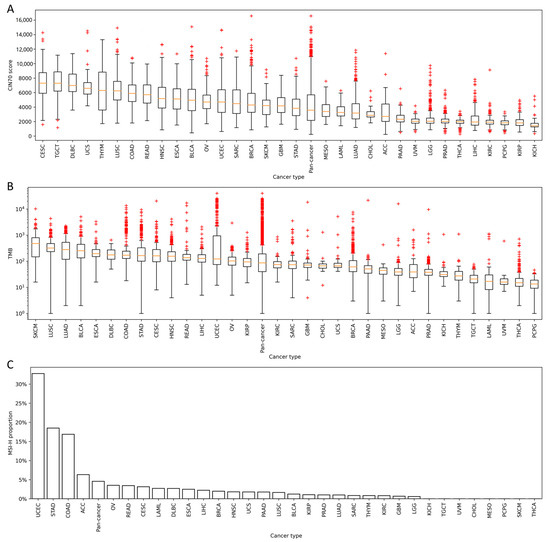 To assess the distribution of CIN70 and TMB across various cancers, we firstly downloaded the gene expression data and somatic mutation data from The Cancer Genome Atlas (TCGA) database, in which data were collected across 33 cancer types. The CIN70 and TMB were calculated for each sample and the distribution of CIN70 and TMB in 33 cancers are shown in Figure 1A,B. In addition, the MSI status for each sample was predicted using the MSIseq tool with a high confidence [10,11]. The proportion of MSI-H samples in each cancer type is shown in Figure 1C. Of note, eight cancer types had no MSI-H samples predicted by MSIseq.